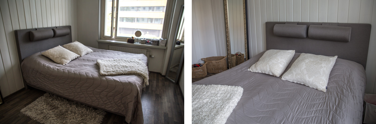 - Päädyin tähän sänkyyn, koska se oli ihan minun näköinen ja sen harmaa sävy sopii sisustukseen todella hyvin. Niskatyynyt ovat mukava lisä, kun haluaa lukea vaikkapa kirjaa sängyssä. Ne saa tarvittaessa myös pois.