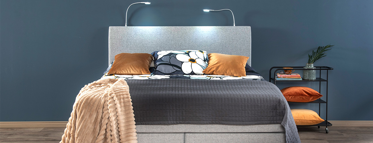Sängyn viereen sopii yöpöytä, johon on helppo laskea nukkumaanmennessä kirjat, lehdet ja silmälasit. Laatikolliseen yöpöytään saat piiloon iltaisin tarvittavat lääkkeet ja kosmetiikan. Myös lukuvaloon kannattaa satsata. Jos sängyssä nukkuvilla on erilainen unirytmi, tulee valaistuksen olla säädettävissä niin, ettei se häiritse toista.