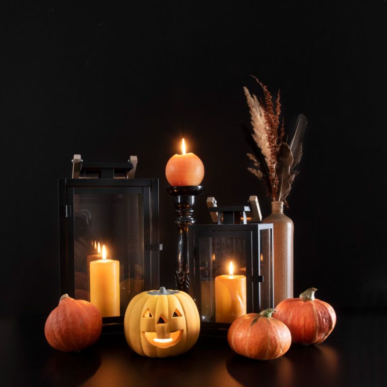 Musta sisustus on kuin luotu Halloweenia varten. Käytä mustan tehostevärinä valkoista, oranssia ja punaista. Valkoiset pääkallot ja luurangot erottuvat hyvin mustasta taustasta. Verenpunainen sopii myös täydellisesti Halloweeniin. Punainen pöytäliina, verhot ja koristetyynyt sopivat teemaan mainiosti.
