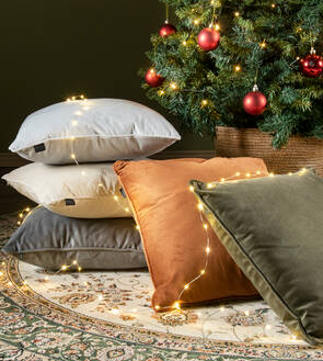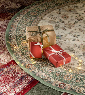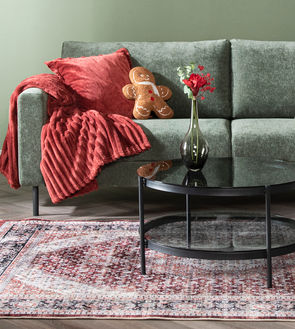 Punainen matto tuo joulun. Sisustajan joululahja voi olla myös valkoinen, pehmeä nukkamatto, tai hopean hohtoinen viskoosimatto. Jouluista sisustajaa ilahduttavat myös uudet koristetyynyt, torkkupeitto tai pöytävalaisin.