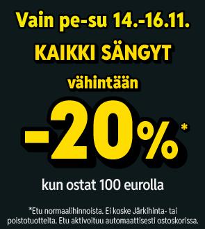 Tarjoustuotteissa kannattaa huomioida aina tarjouksen voimassaoloaika. Tarjouksemme vaihtuvat säännöllisesti, joten kannattaa käydä kurkkimassa kuukausittain verkkokaupan Tarjoussivu. Kun ostat kalusteen, kuten nojatuolin, ruokapöydän tai vaatekaapin voimassa olevan tarjouksen aikana, saat se tarjoushintaan, vaikka tuotteen toimitusaika menisikin tarjousajan ylitse.