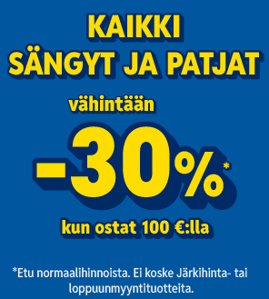 Tarjoustuotteissa kannattaa huomioida aina tarjouksen voimassaoloaika. Tarjouksemme vaihtuvat säännöllisesti, joten kannattaa käydä kurkkimassa kuukausittain verkkokaupan Tarjoussivu. Kun ostat kalusteen, kuten nojatuolin, ruokapöydän tai vaatekaapin voimassa olevan tarjouksen aikana, saat se tarjoushintaan, vaikka tuotteen toimitusaika menisikin tarjousajan ylitse.