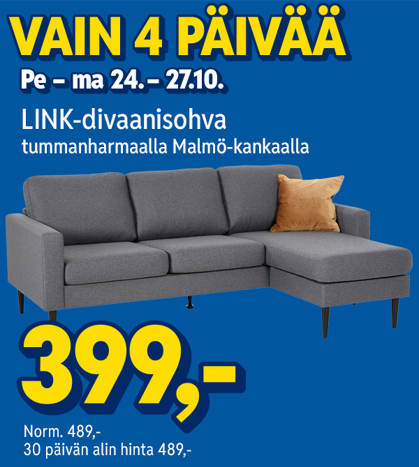 Tarjoustuotteissa kannattaa huomioida aina tarjouksen voimassaoloaika. Tarjouksemme vaihtuvat säännöllisesti, joten kannattaa käydä kurkkimassa kuukausittain verkkokaupan Tarjoussivu. Kun ostat kalusteen, kuten nojatuolin, ruokapöydän tai vaatekaapin voimassa olevan tarjouksen aikana, saat se tarjoushintaan, vaikka tuotteen toimitusaika menisikin tarjousajan ylitse.