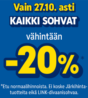 Sotkan Tarjoukset-sivulta löydät kaikki ajankohtaiset tuotteet ja tarjoukset aina parhaaseen hintaan. On kyseessä sitten tarjous sohva tai olohuoneeseen tarjous matto, löydät ne helposti Sotkan verkkosivuilta. Hyödynnä myös kuukauden kampanjaedut ja sesonkien, kuten terassikalusteiden tarjoukset. Kun on aika hankkia uusi sänky, kaikki sänkytarjouksemme löytyvät täältä!