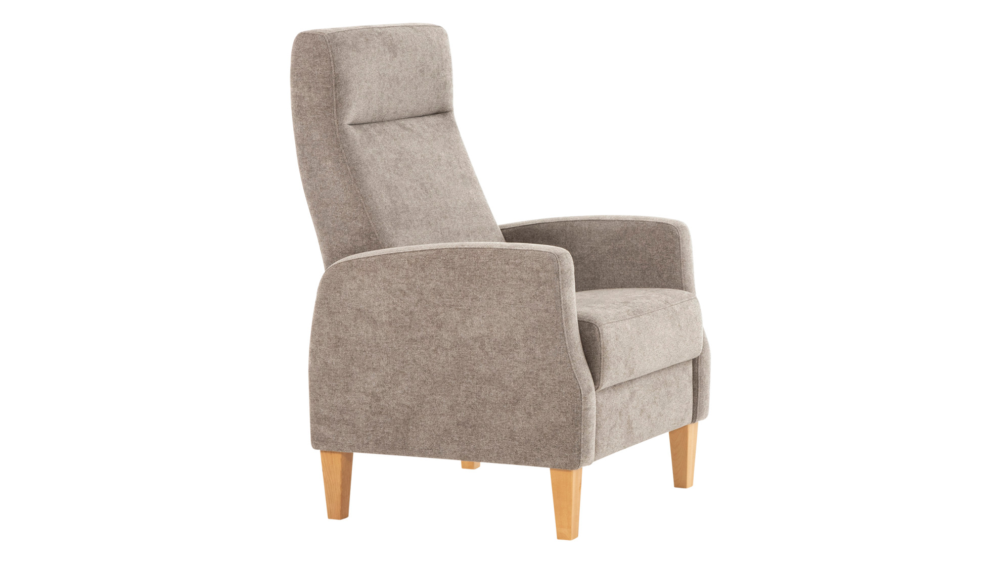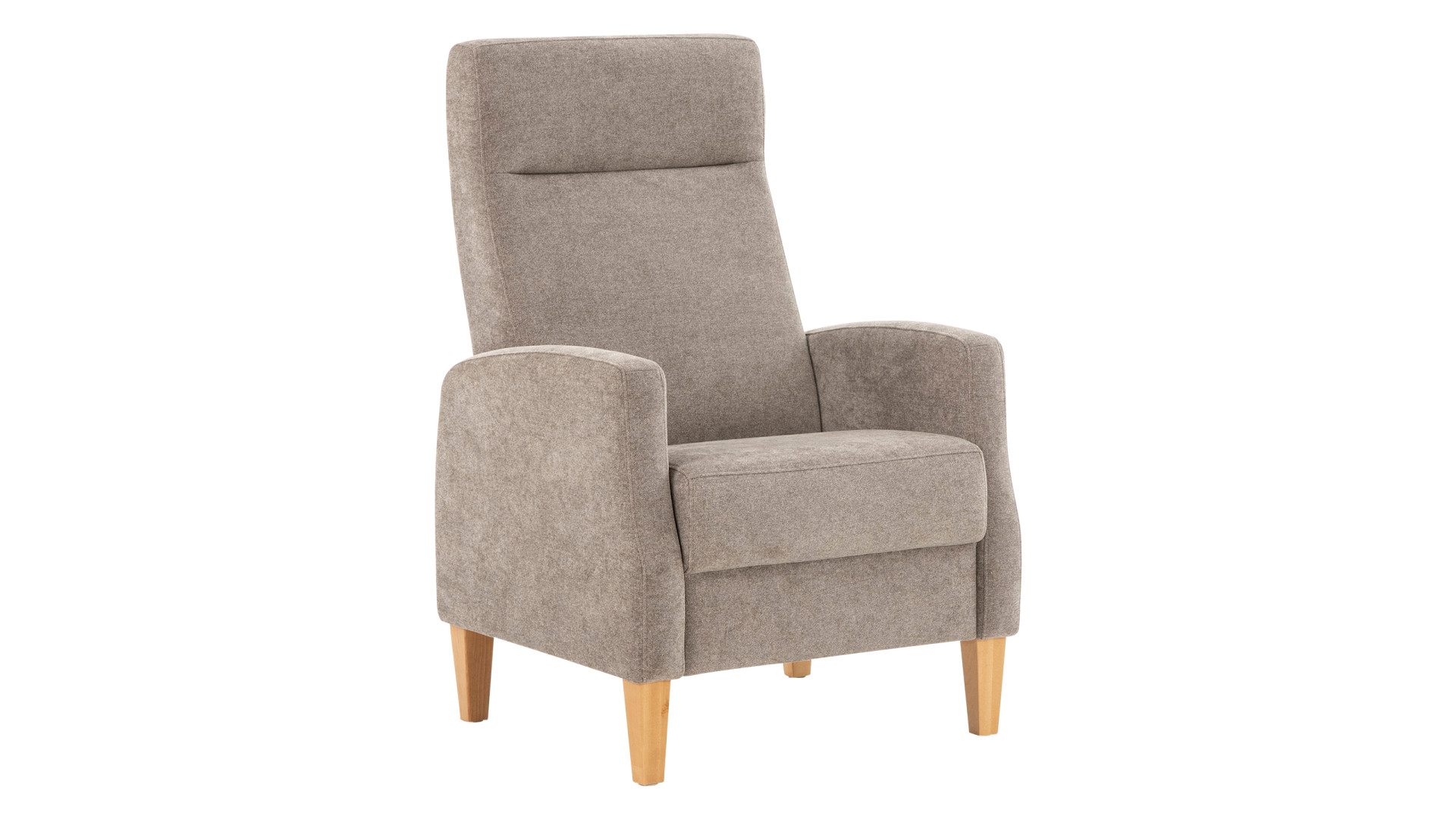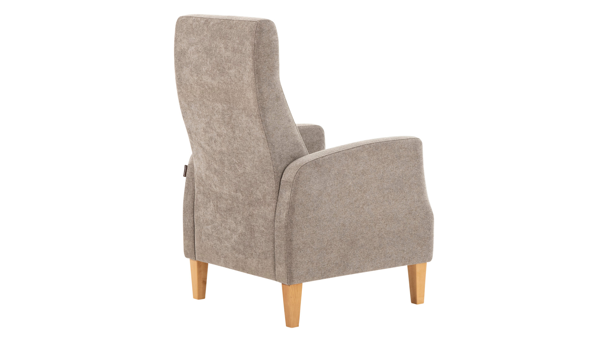 Kuvan Oscar-lepotuoli on verhoiltu Cloud-kankaalla sävyllä 09 beige ja siinä on 15 cm korkeat luonnonvaaleat puujalat.
