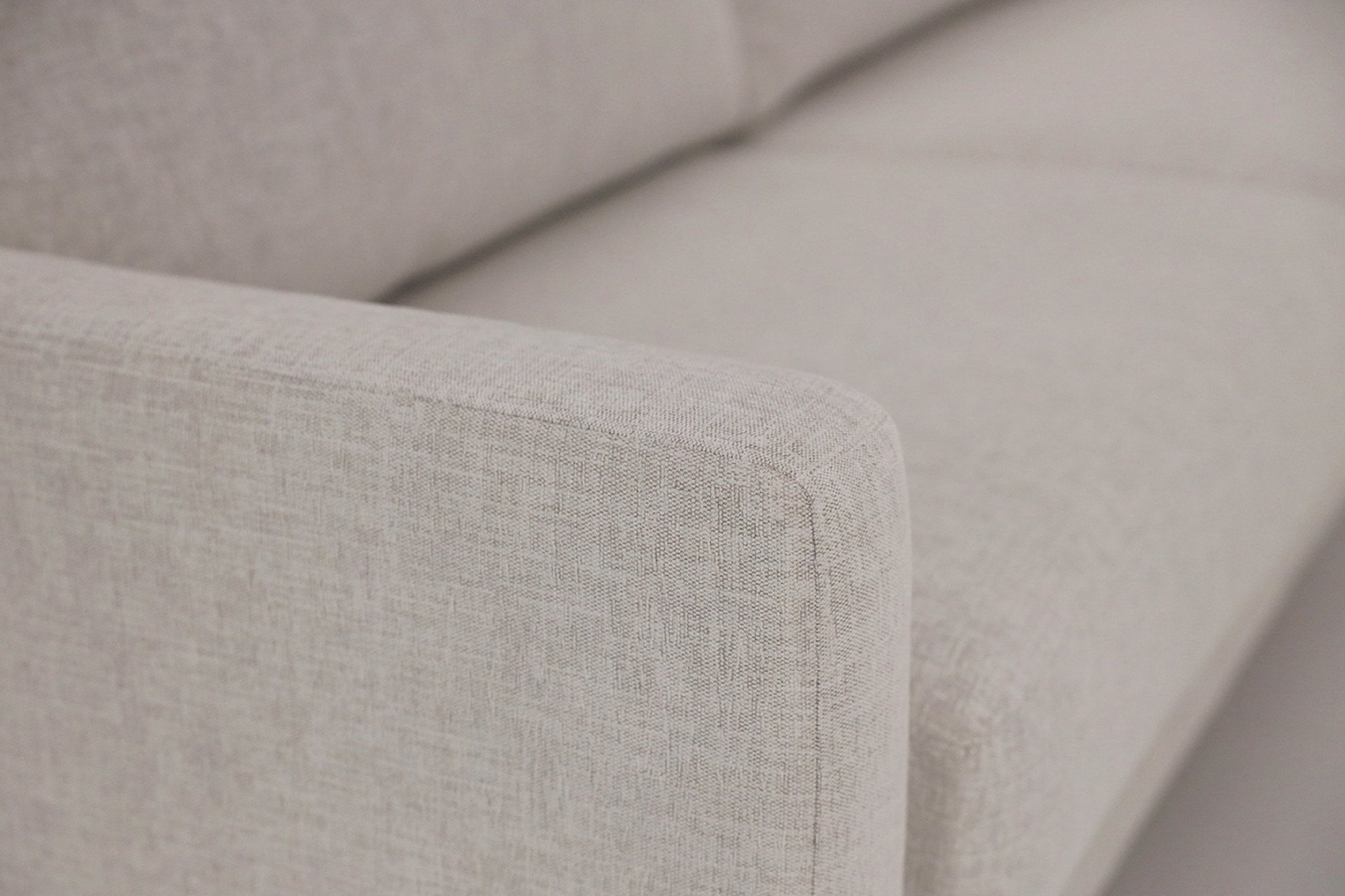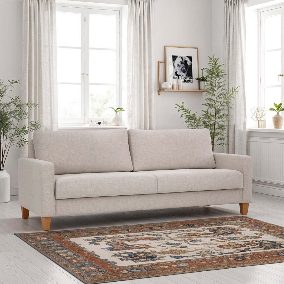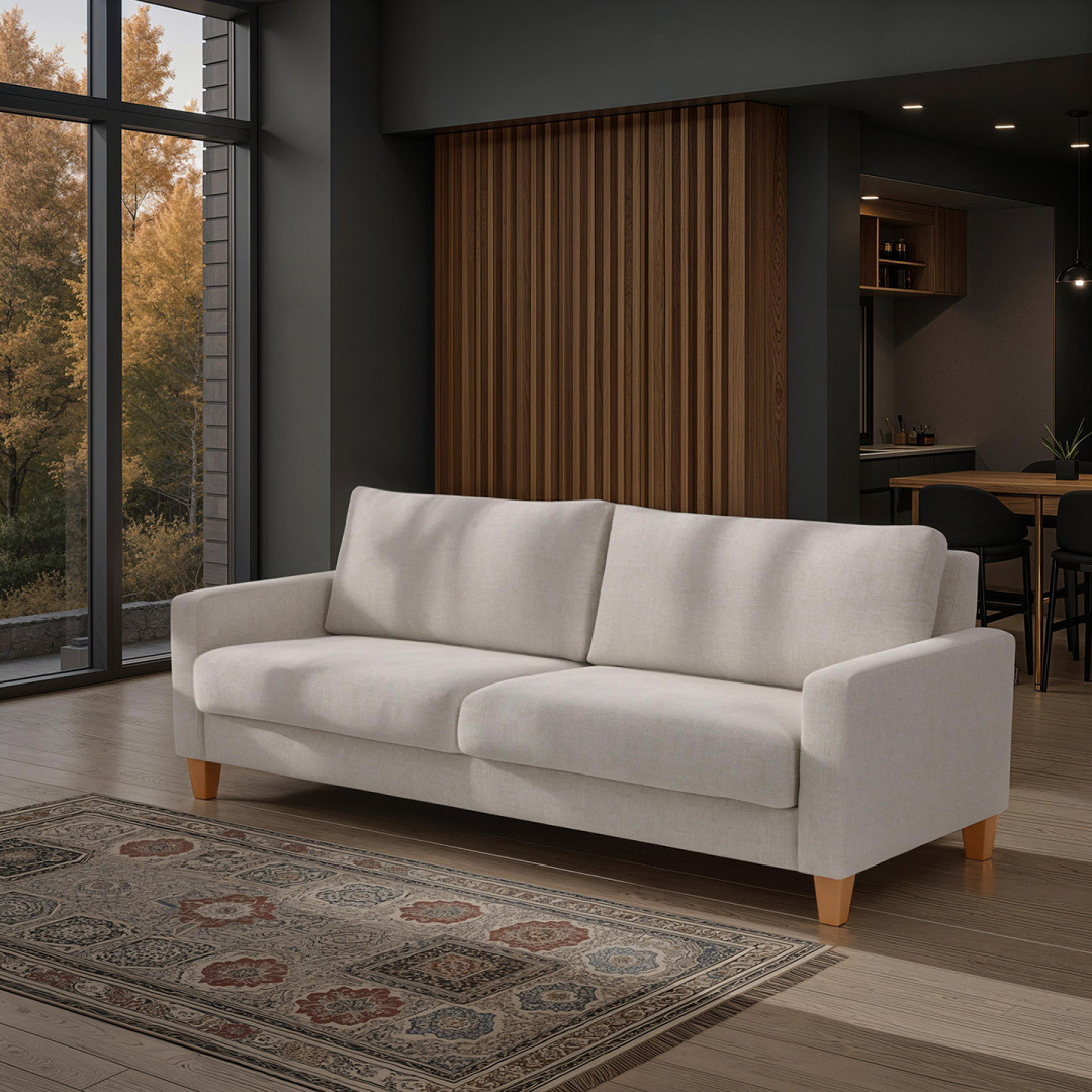 Reilun kokoinen, kolmenistuttava Dali-vuodesohva verhoiltuna Manhattan-kankaalla.