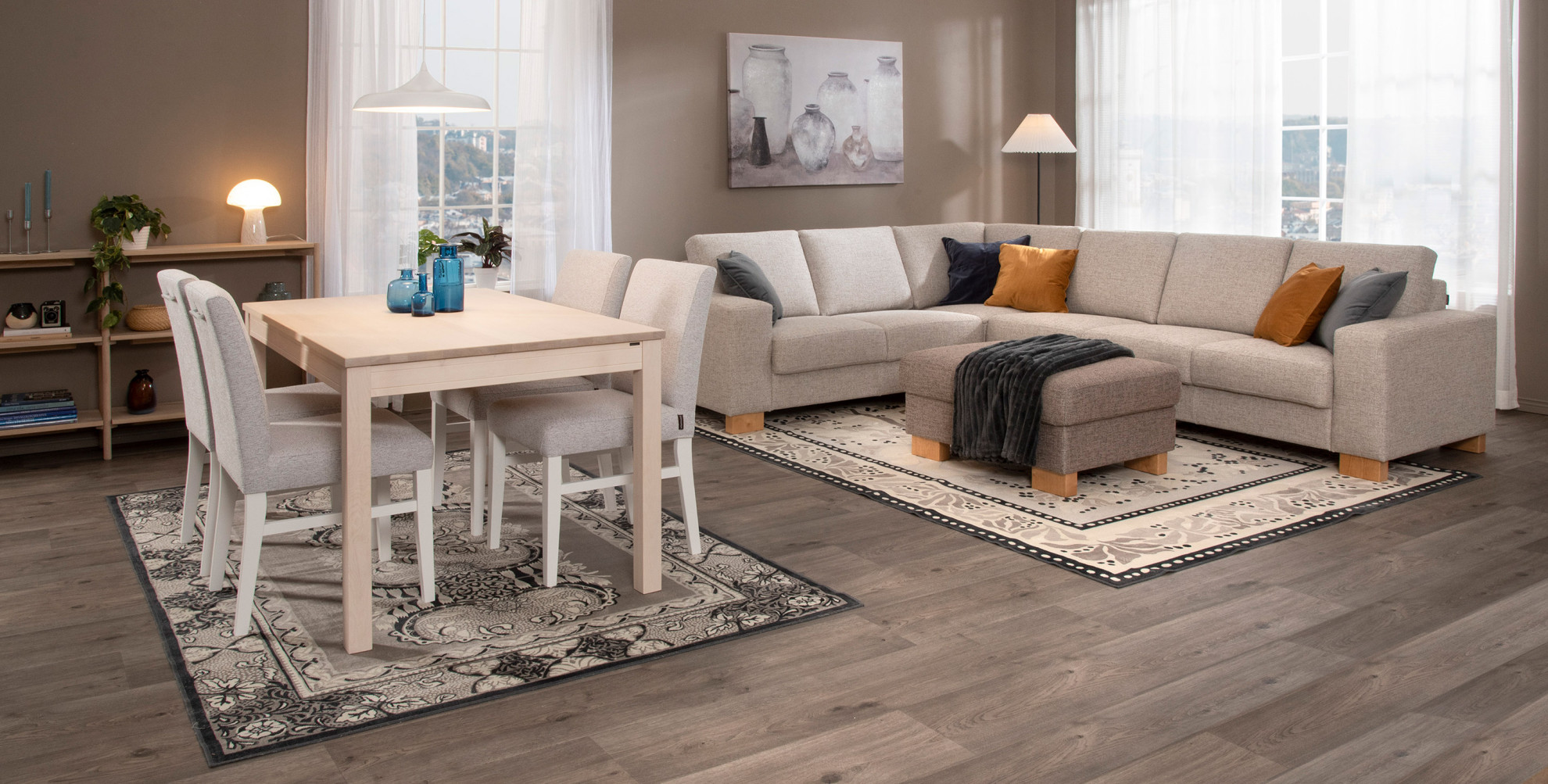 Tuolin verhoilu vaalean harmaata LEA-kangasta. Voit halutetessasi tilata toimitusmyyntinä myös muita verhoiluvaihtoehtoja. Kankaat ja nahat esillä myymälöissä.