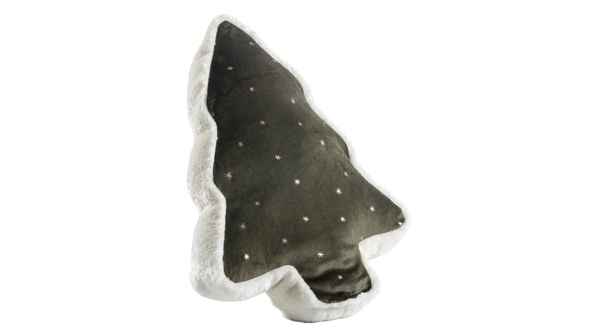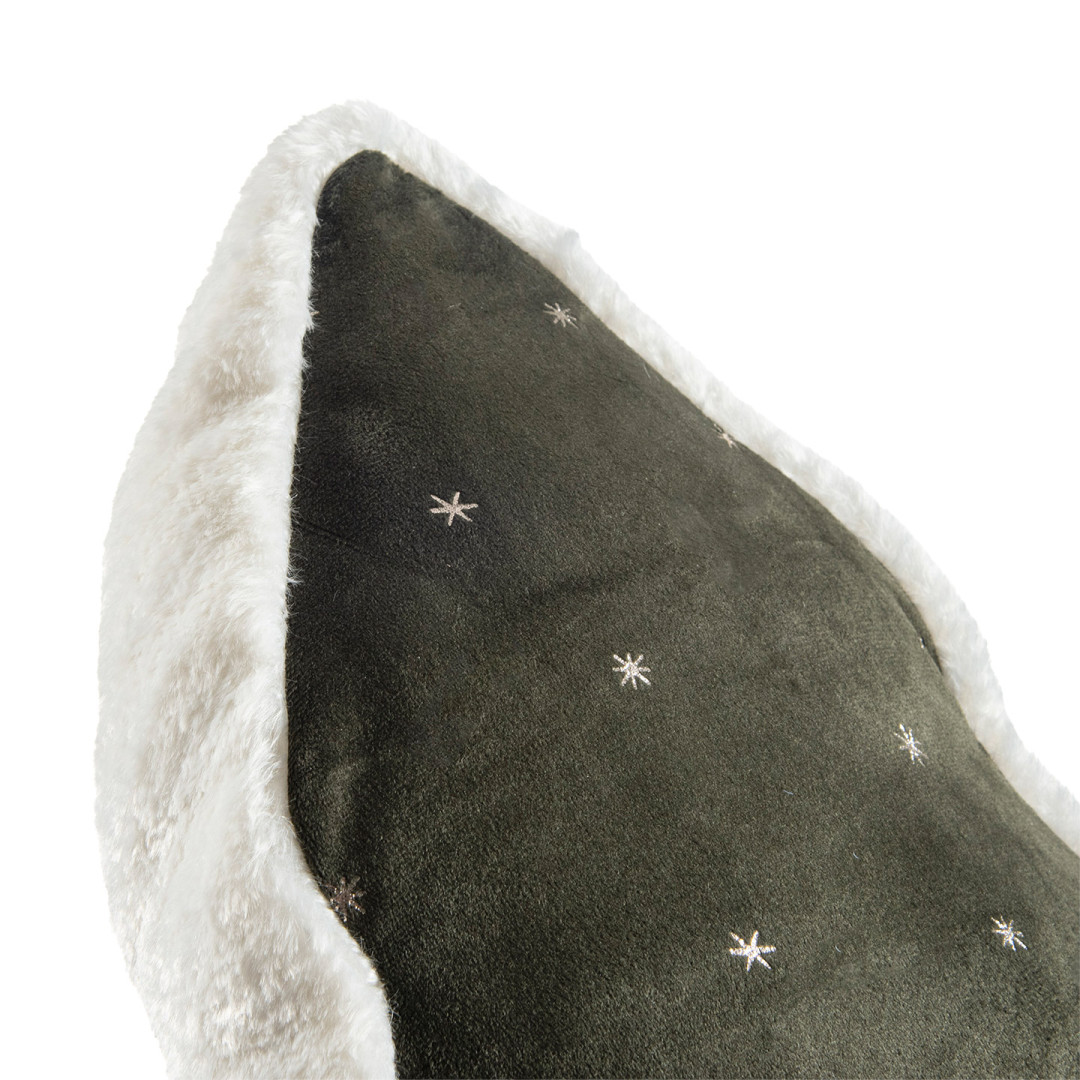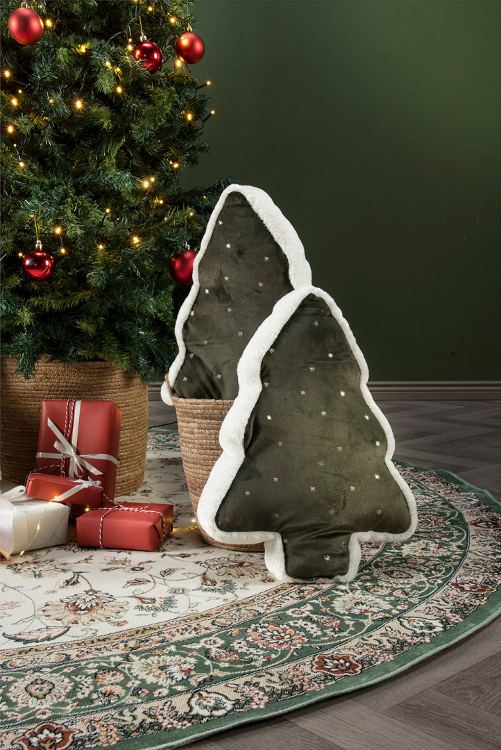 Joulukuusen muotoinen vihreä koristetyyny turkistaustalla voisi olla loistava lisä joulunajan sisustukseen.