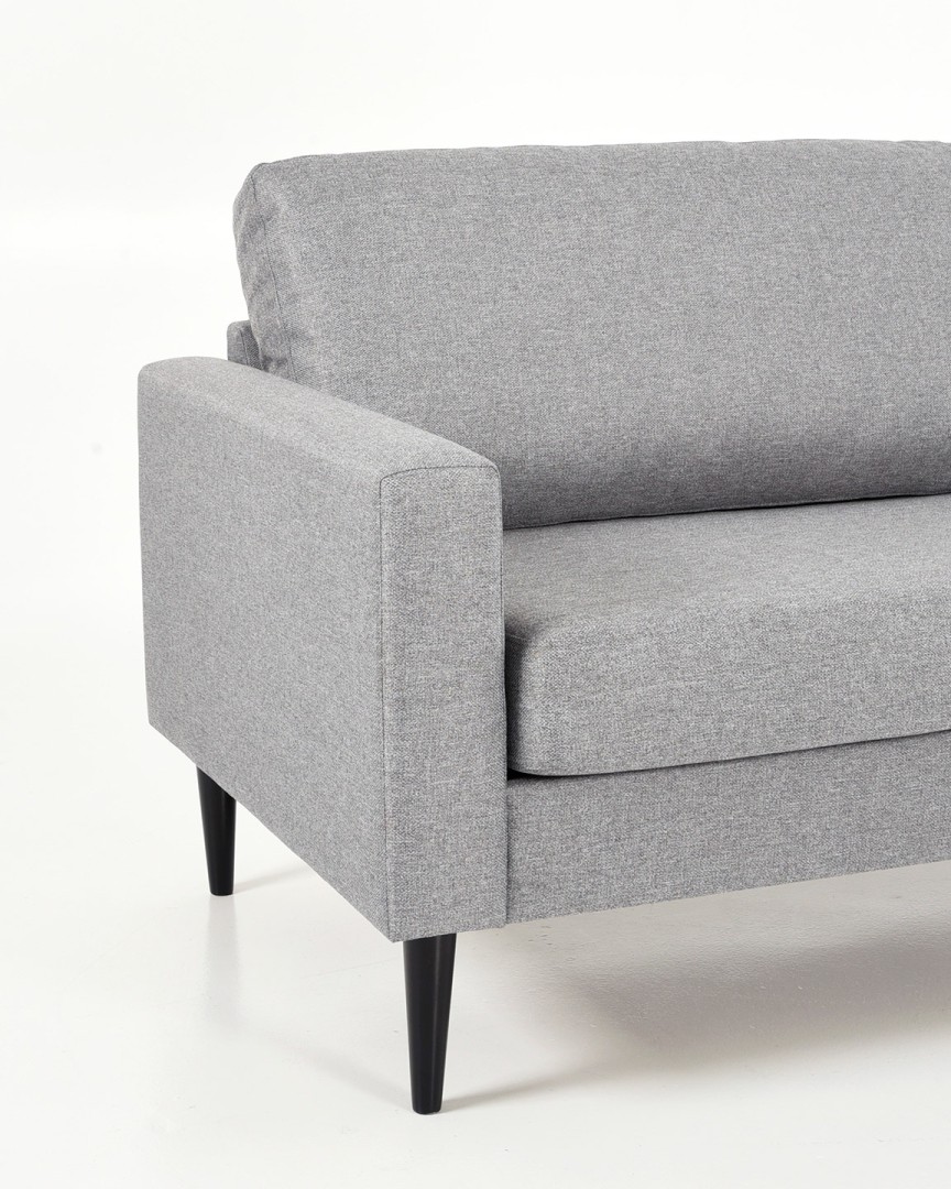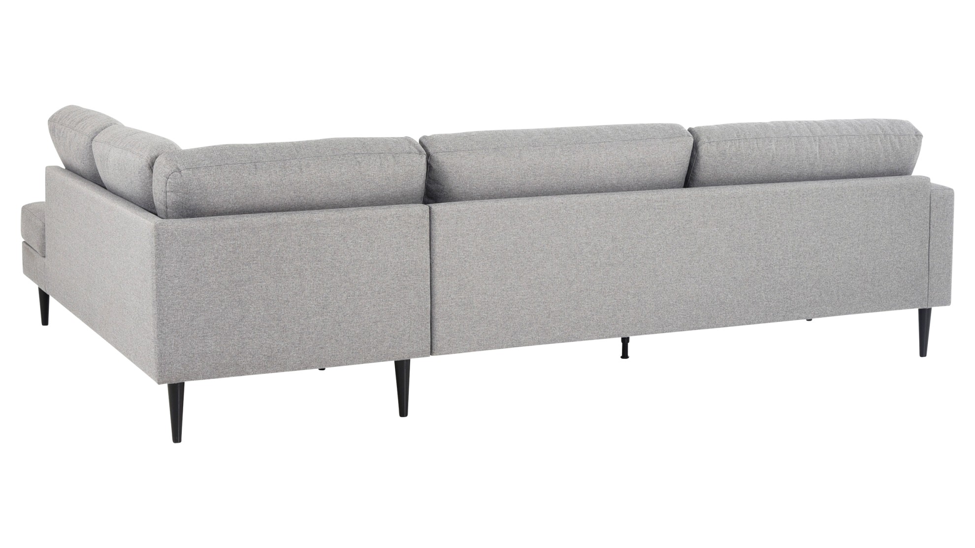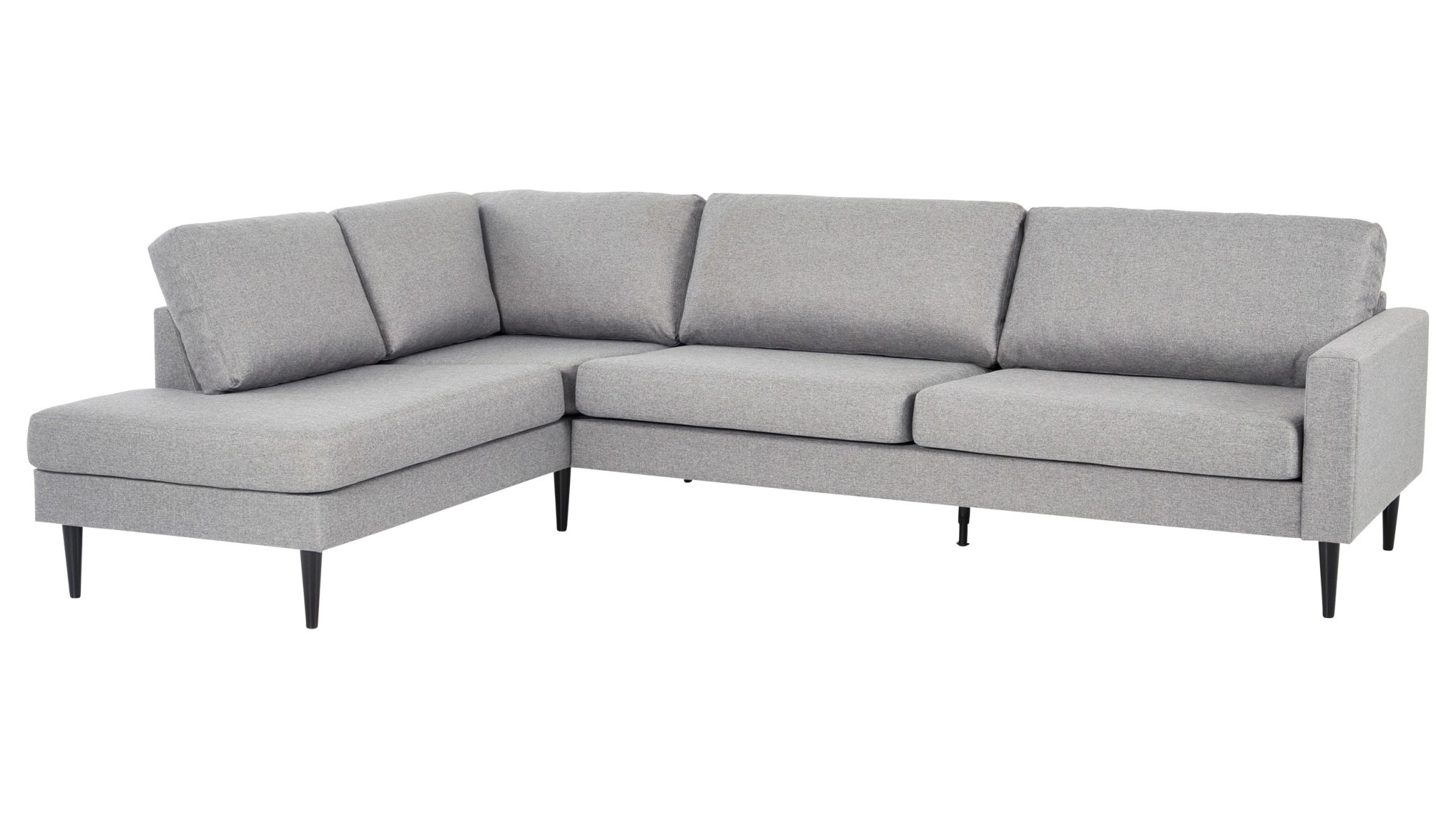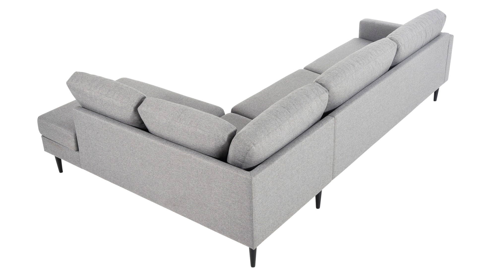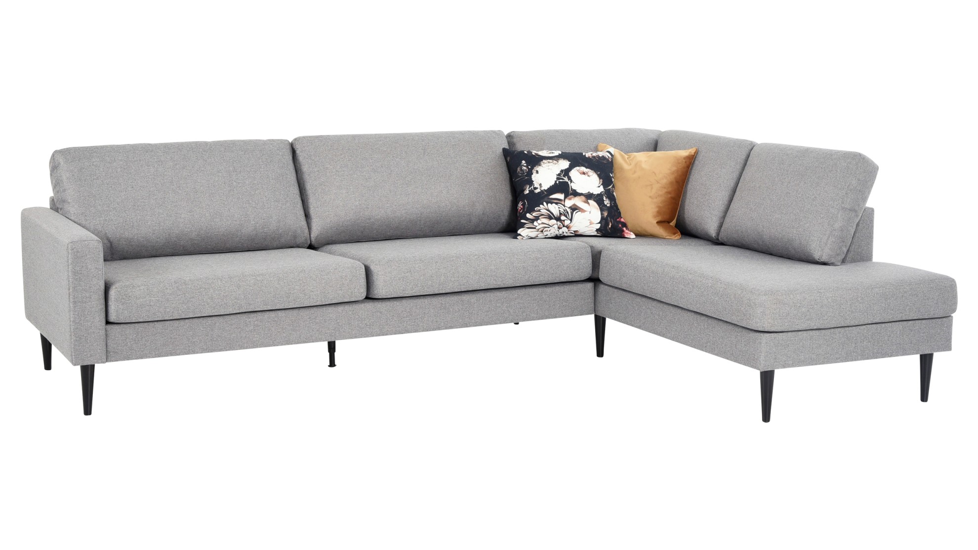 Ajanhenkinen sekä kevytrunkoinen kulmasohva avopäädyllä, verhoiltuna harmaalla Malmö-kankaalla.