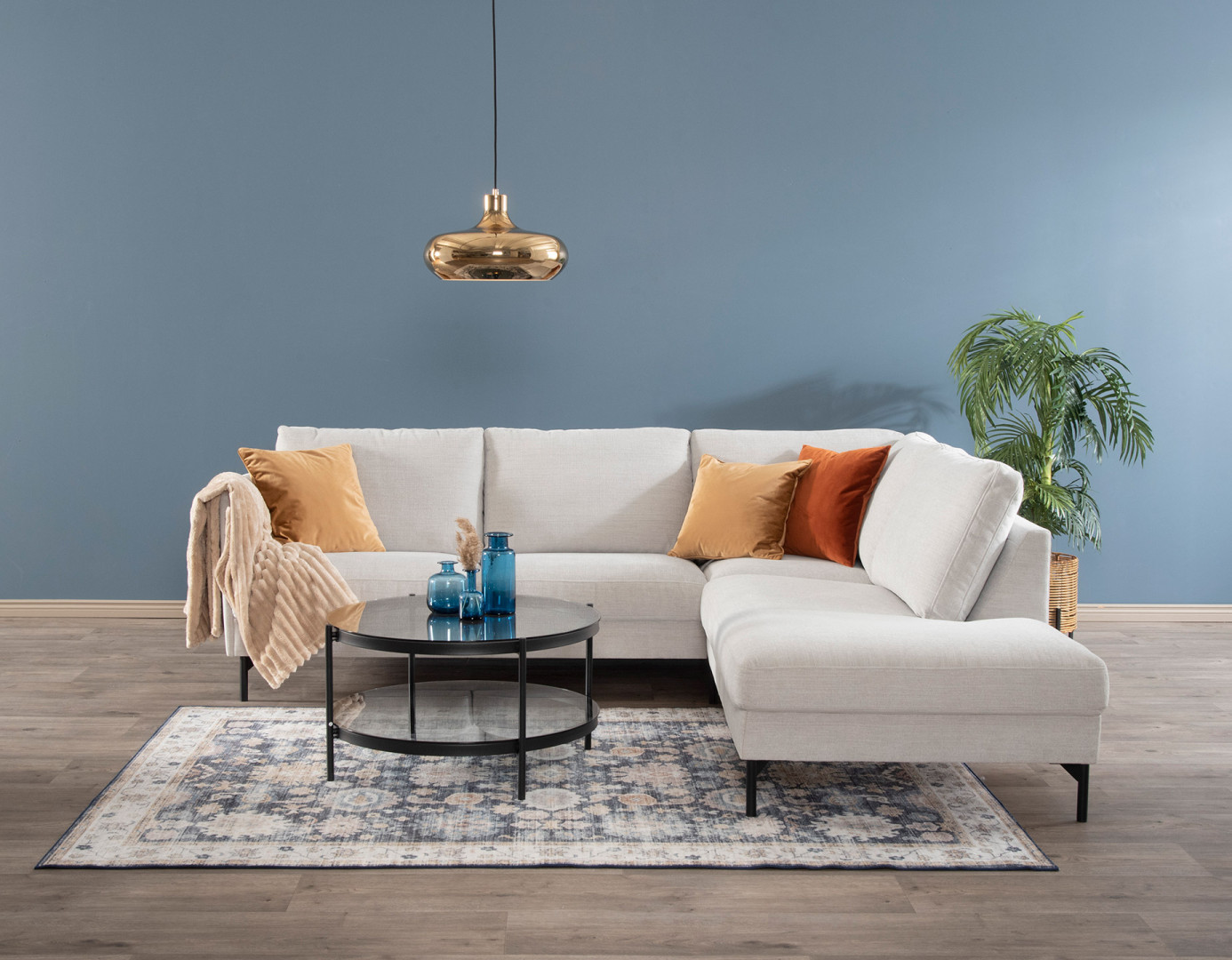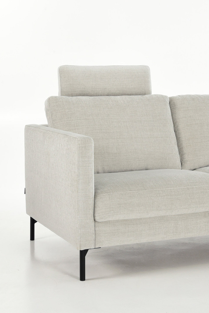 Ajanhenkinen, kevytrunkoinen kulmasohva, harmaan sävyisellä Marble-kankaalla verhoiltuna. Istuintyynyt on kiinnitetty sohvan runkoon ja selkätyynyt ovat käännettävät. Tämä kulmasohva tarjoaa runsaasti istumatilaa ja mukavuutta rentoutumiseen, perhehetkiin tai ystävien kanssa vietettyihin iltoihin. Korkeat jalat helpottavat siivousta ja antavat sohvalle kevyen ulkonäön.