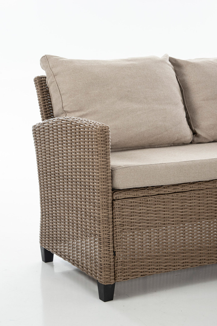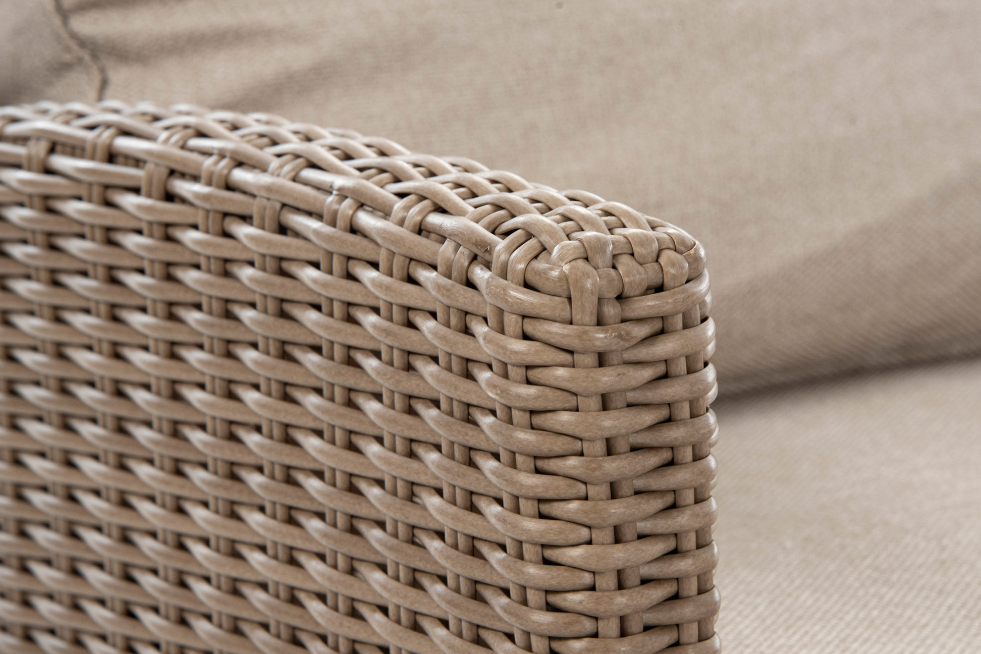 MARINELLA on suunniteltu kestämään ulkoilman vaihtelevia olosuhteita. Vankka teräsrunko ja kestävä, vaalean sävyinen rottinkipunos varmistavat sohvan käytännöllisyyden. Pehmeät pehmusteet tarjoavat istujalle mukavuutta, ja niiden säänkestävä kangas säilyttää käyttömukavuutensa mainiosti. Sateella pehmusteet kannattaa ottaa sateensuojaan.
