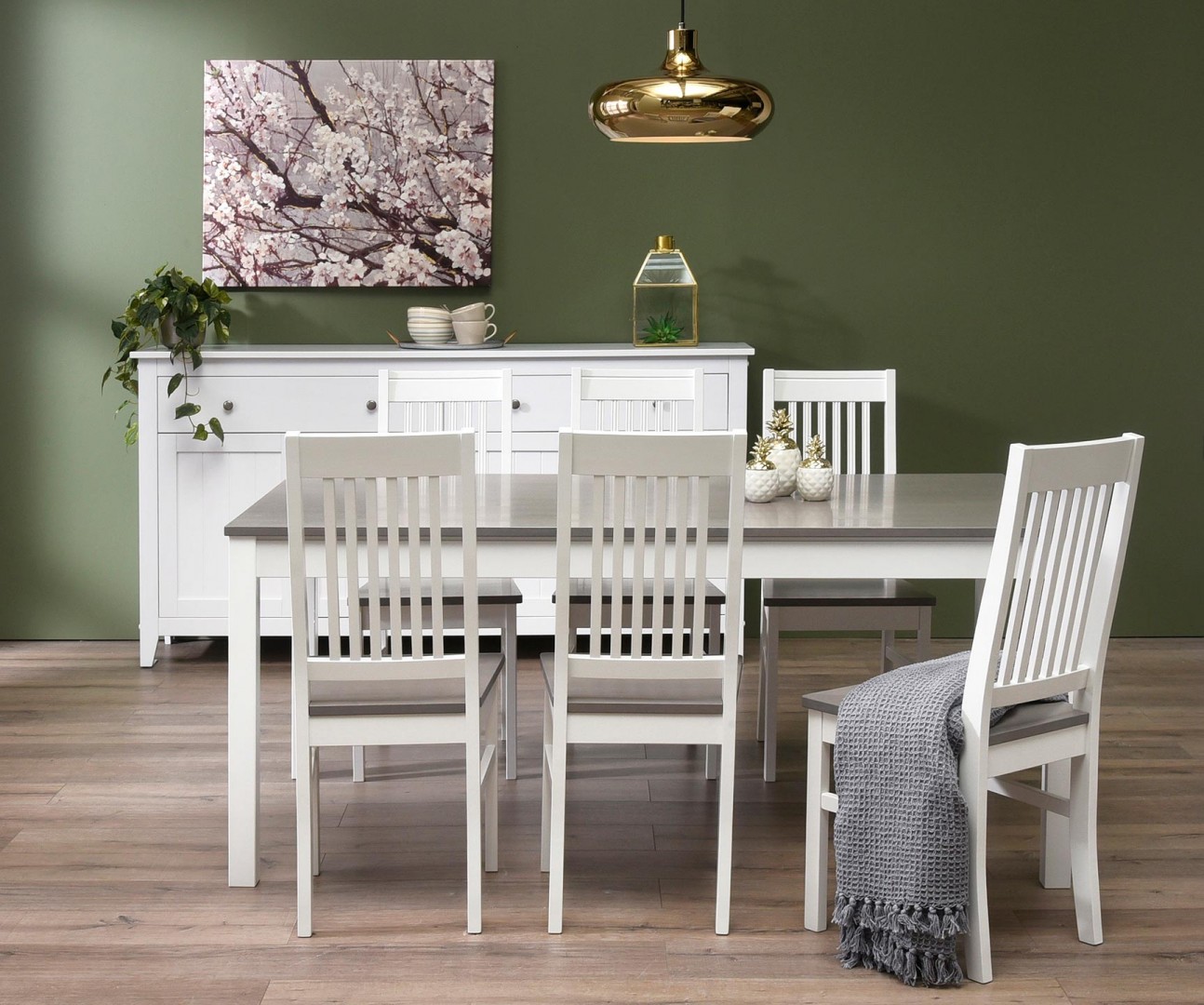LIIA-ruokaryhmän pöytä ja tuolit on valmistettu koivusta. Pöydän kansi ja tuolien istuinosa ovat harmaat. Perinteinen pöytäryhmä sopii monenlaiseen sisustukseen. Harmaassa värissä puun kuvio kuultaa upeasti läpi.