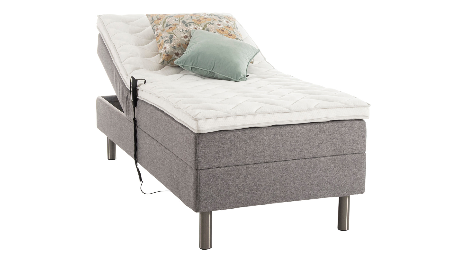 Moottorisänky on verhoiltu upealla harmaalla verhoilukankaalla ja sänkyyn sisältyy verhoiluun upeasti sointuvat harjatut metallijalat.