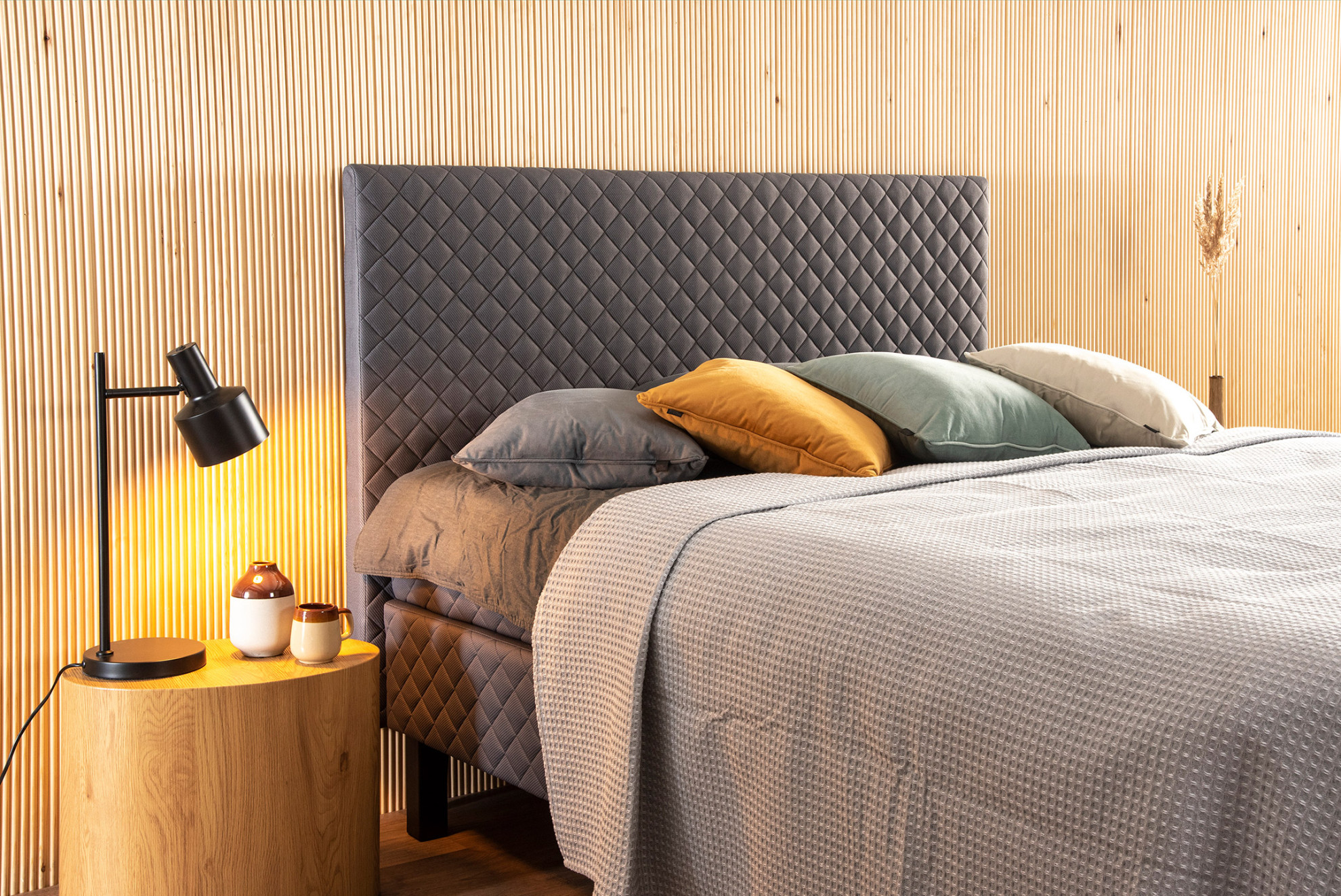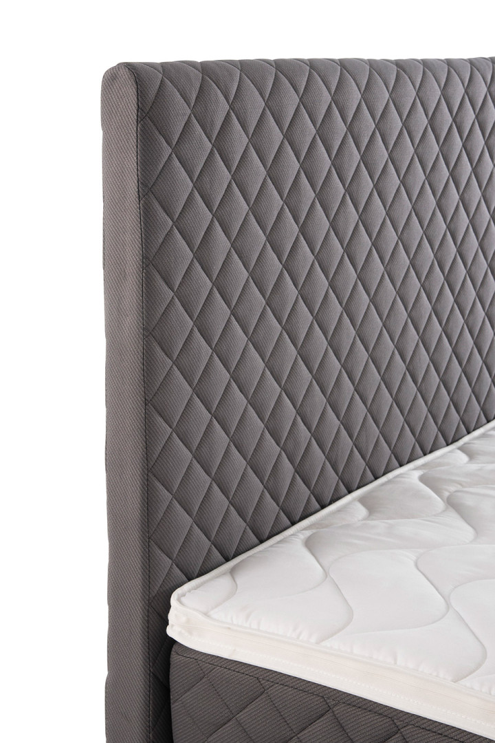 JUNI-jenkkisänky ei ainoastaan näytä hyvältä, vaan se on myös käytännöllinen ja helppohoitoinen. Jenkkisängyn elegantti tummanharmaa, salmiakkikuvioitu kangas tuo makuuhuoneeseesi hienostunutta tyyliä. Tämä ajaton väri ja moderni muotoilu luovat rauhallisen ja tyylikkään ilmapiirin, joka kestää aikaa ja trendejä. Pakettiin kuuluu myös upea sängynpääty, joka on päällystetty samalla tyylikkäällä kankaalla kuin sänky. Tämä yhteensopiva sängynpääty luo yhtenäisen ja harmonisen ilmeen makuuhuoneeseesi, lisäten ripauksen eleganssia ja ylellisyyttä. Pääty asetataan lattialle sängyn ja seinän väliin.