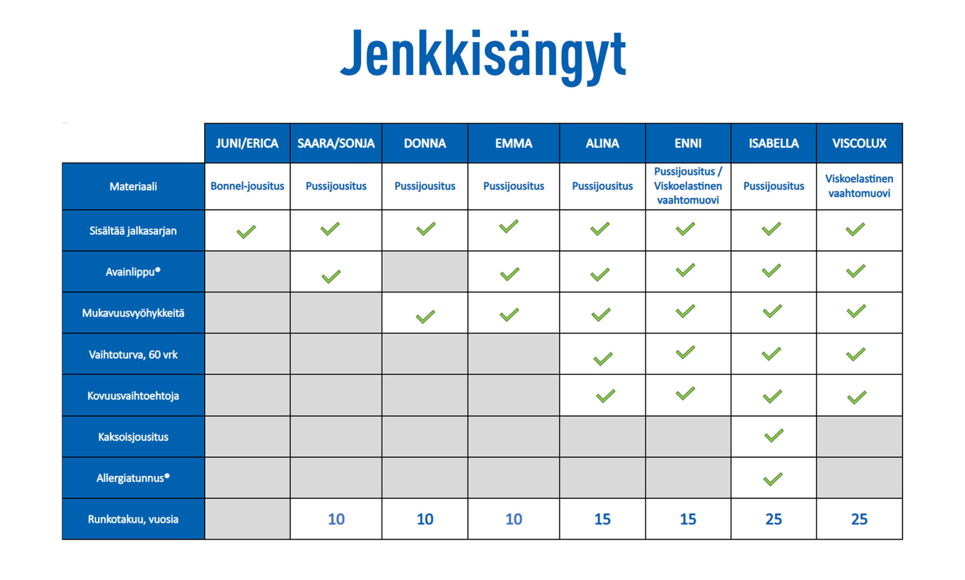 Uudistunut ja pysyvästi edullinen JUNI-jenkkisänky 160x200 cm on mainio valinta niille, jotka haluavat yhdistää tilavuuden, mukavuuden ja tyylikkyyden. Tämä 160 cm leveä jenkkisänky tarjoaa tilaa kahdelle hengelle, tehden siitä hyvän valinnan kevyemmille nukkujille tai vaikka vierashuoneeseen. Sängyssä on bonnel-jousitus, joka takaa pehmeän ja mukavan unen joka yö. Vankka, alta kierrettävä jalkasarja sekä PISCINA-sijauspatja sisältyvät hintaan.