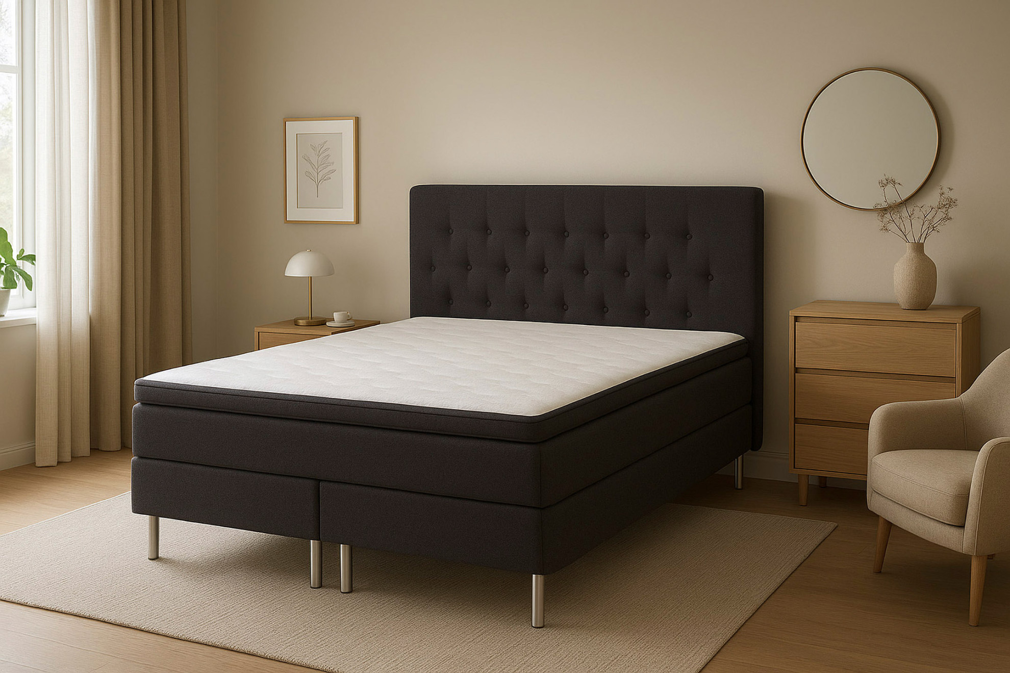 Pakettiin sisältyy 7 cm vaahtomuovi sijauspatja, joka viimeistelee nukkumismukavuuden, sekä näyttävä, napitettu sängynpääty, joka antaa kokonaisuudelle modernin ja elegantin ilmeen.