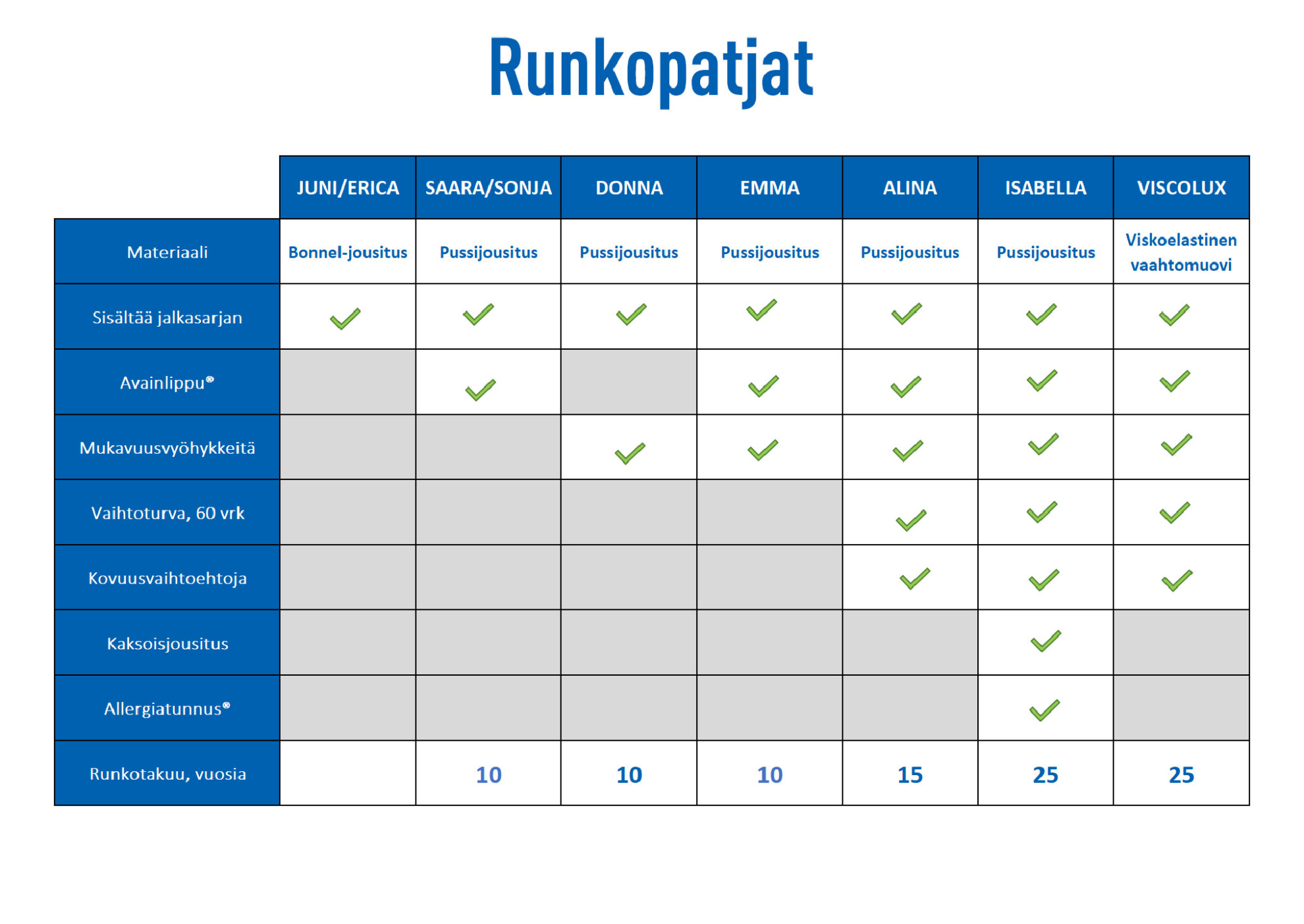 Harmaa runkopatja on tyylikäs ja käytännöllinen valinta. Pakettiin kuuluu mukaan muhkea Piscina-sijauspatja, jonka sisus on vaahtomuovia. Suosittelemme sijauspatjansuojan käyttöä, jolla pidät vuoteen raikkaana ja lisäät sijauspatjan käyttöikää.