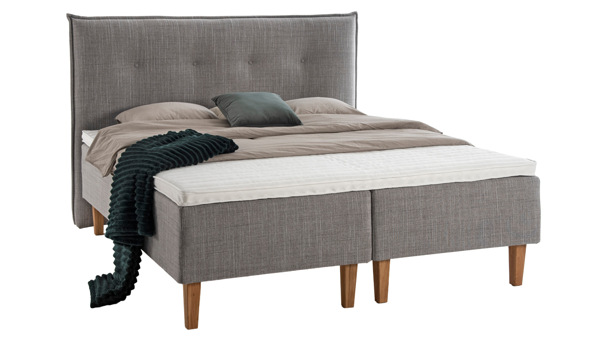 Claudia-runkopatjan verhoilu on saatavana kauniilla vivahteikkaalla harmaalla tai beigellä verhoilukankaalla