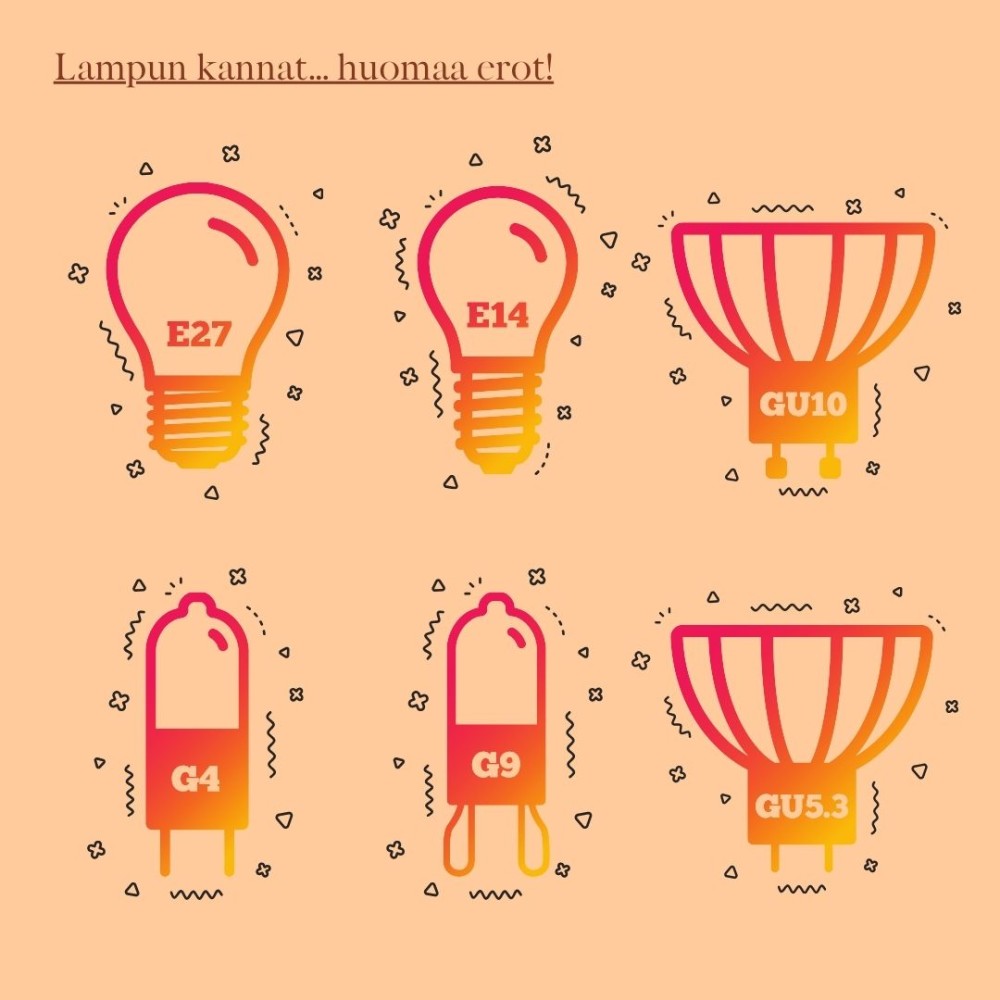 Myös E14, E27, GU4, GU5.3, GU9, GU10 ja GX53 ovat tavallisia led-lamppujen kantoja. Tarkista valaisimesta aina lampun kannan koko ja malli, sekä sallittu wattimäärä ennen lamppuostoksille lähtöä.